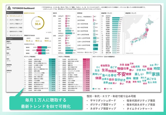 全72項目の実感度と重視度から回答者自身のウェルビーイング状況を把握するLM独自の指標。ウェルビーイング発想のマーケティングサービス『TOTONOID(ととのい度)』として2025年7月31日に提供を開始した。毎月1万人にアンケートを聴取し、日々移り変わる生活者ウェルビーイングのトレンドを調査。調査結果はBIツールで可視化し、無料で公開している。