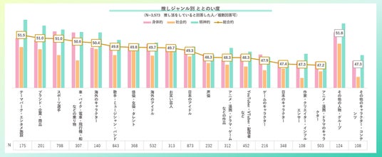 「テーマパーク・エンタメ施設」推しが最も幸福度の指数が高く、51.5点となった。「スポーツ選手」「乗り物」推しは身体的な幸福度の指数が高い傾向が見られた。