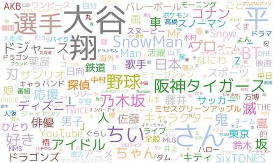 自由記述形式で推している人や物の名前を聴取したところ、「大谷翔平選手」をはじめとする野球選手やプロ野球、メジャーリーグの球団の他、「SnowMan」「SixTONES」といった日本のアイドルも多く見られた。