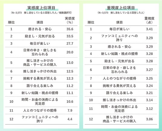 推し活で感じたポジティブなことは「癒される・安心」の回答が35.6%と最も多く、幸福度を高める出来事として最も重視されているのは「毎日が楽しい」。