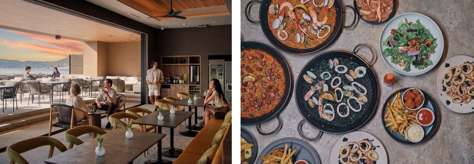 朝食からディナーまで提供する「Restaurant eden SETOUCHI」では、小豆島の旬の魚介や島野菜、オリーブ牛、オリーブハマチなど、島の風土に根ざした食材を生かし、一日を通して楽しめる食の体験を提供します。料理は、讃岐の赤味噌や白味噌で仕上げたパエリア各種をはじめ、地中海料理やスパニッシュをベースに展開。地域の食文化を取り入れながら、eden SETOUCHIならではの一皿に仕立てています。また、小豆島の地酒やワイン、地ビール、オリジナルのリゾートカクテルなどを取り揃え、食事の時間やシーンに合わせた一杯を楽しめます。