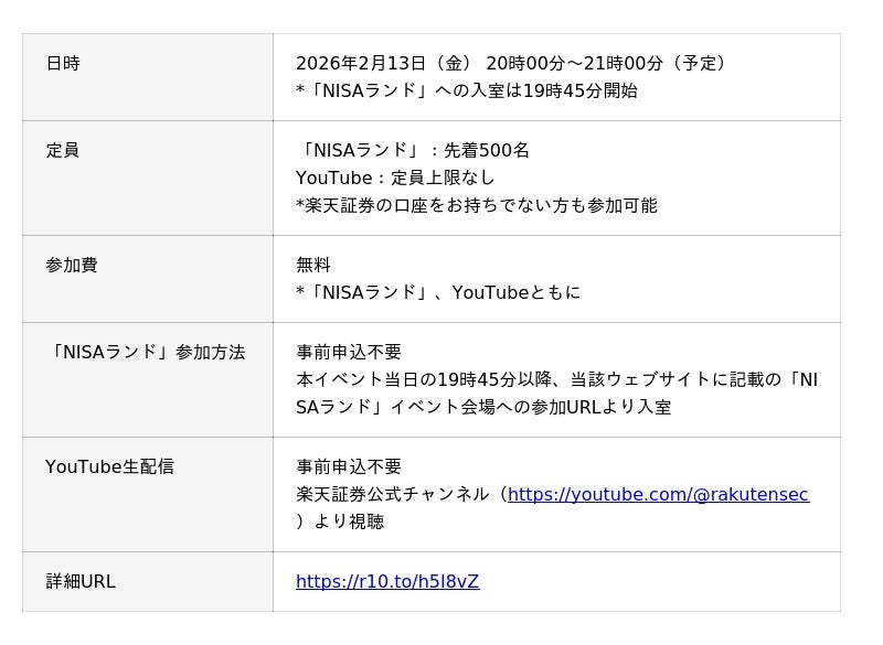 楽天証券株式会社(本社:東京都港区、代表取締役社長:楠 雄治、以下「楽天証券」)は、NISAの日にあわせ、2026年2月13日(金)20時より、バーチャル空間「NISAランド」にアバターで参加可能なオンラインイベント、「全国から集まれ!-楽天証券NISAフェス2026- 2月13日はNISAの日!全員集合!」を開催することをお知らせします。本イベントの参加者は、スペシャルゲスト、著名トレーダー テスタ氏によるトークセッションやクイズ大会などに参加ができます。