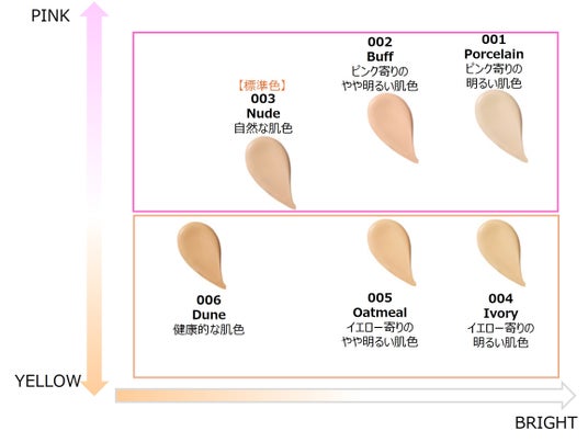 今回登場する新色はウォーム系のイエベ肌向けベージュ。明るい肌色の「004 アイボリー」、やや明るい肌色の「005 オートミール」、健康的な肌色「006 デューン」の3色。日本企画の商品だから実現した、アジア人にフィットする色味で色なじみがよく、ナチュラルなツヤ感のある肌をつくりあげます。既存色3色と合わせた6色展開だから、自分のなりたい肌に近づけるカラー選びが可能に。