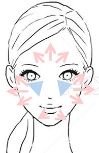 2.まず、頬の高い部分(ブルーの三角部分)につけて明るさを出し、外側に向かってやさしく叩き込むように伸ばします。