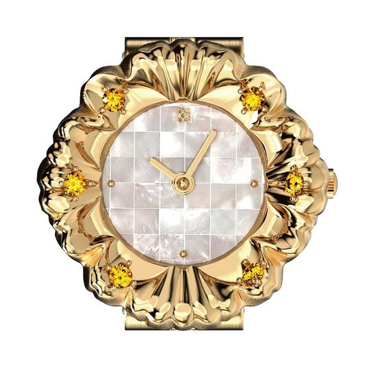 「Baroque Watch Ring」は、クラシカルな建築様式に見られる造形や装飾を、指輪サイズのミニチュアウォッチとして落とし込んだコレクションです。PC21クオーツムーブメントを搭載し、コンパクトなサイズながら時間の確認ができる実用性も備えています。