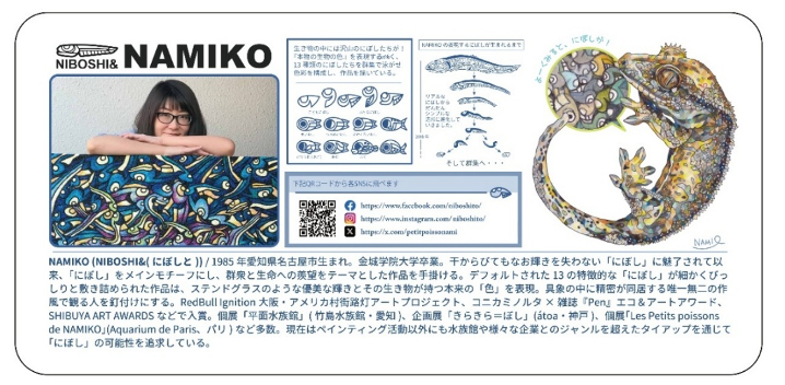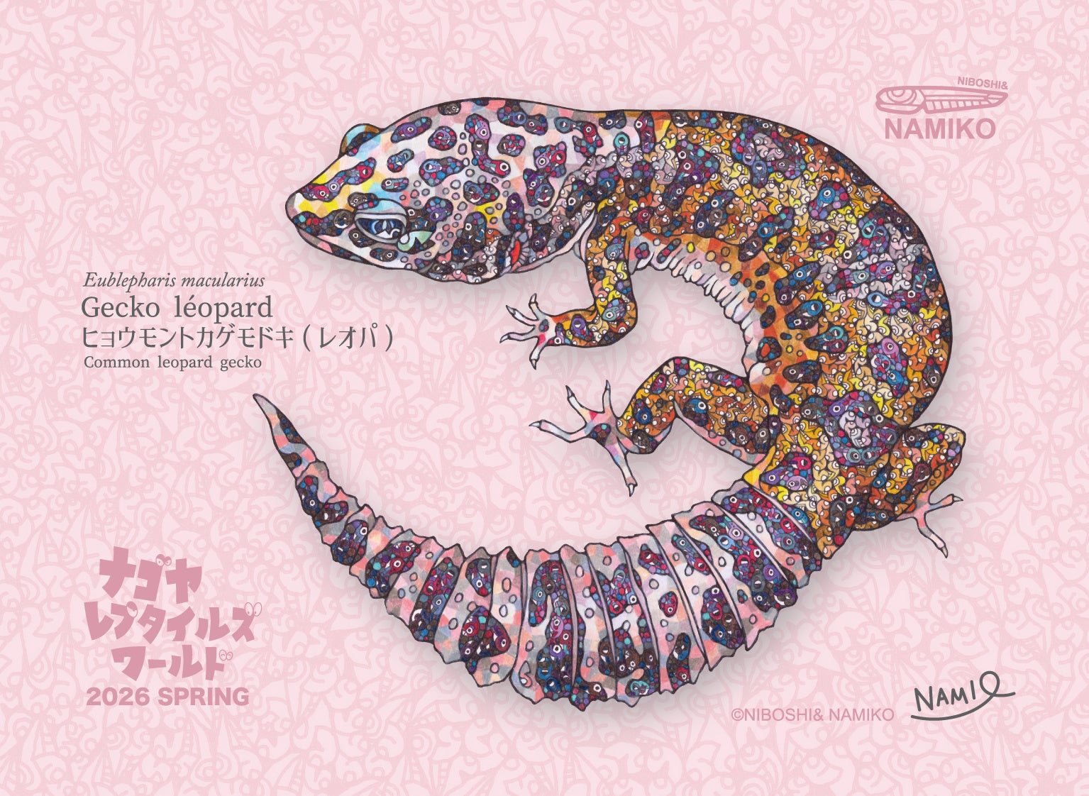 また、ナゴヤレプタイルズワールド2026春の開催に合わせ、ファミマプリントで3種の記念ステッカーを発売いたします。デザインは、「にぼし」で描かれた緻密で色鮮やかなアート作品を生み出すNAMIKO氏が担当。「ナゴヤレプタイルズワールド2026春」に最速入場できるご購入者特典もございます。「ファミマプリントナゴレプ記念ステッカー2026春いずれか1枚」と「各種有料チケット」をご提示いただいた方を対象に、優先的に入場のご案内をさせていただきます。