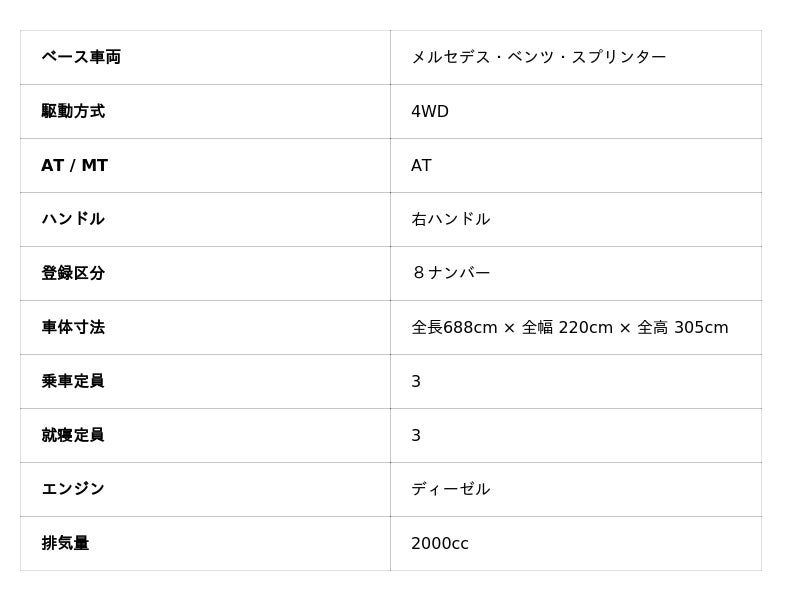 メルセデス・ベンツ スプリンターをベースにした、本格派4×4オフロードキャンピングカーです。
