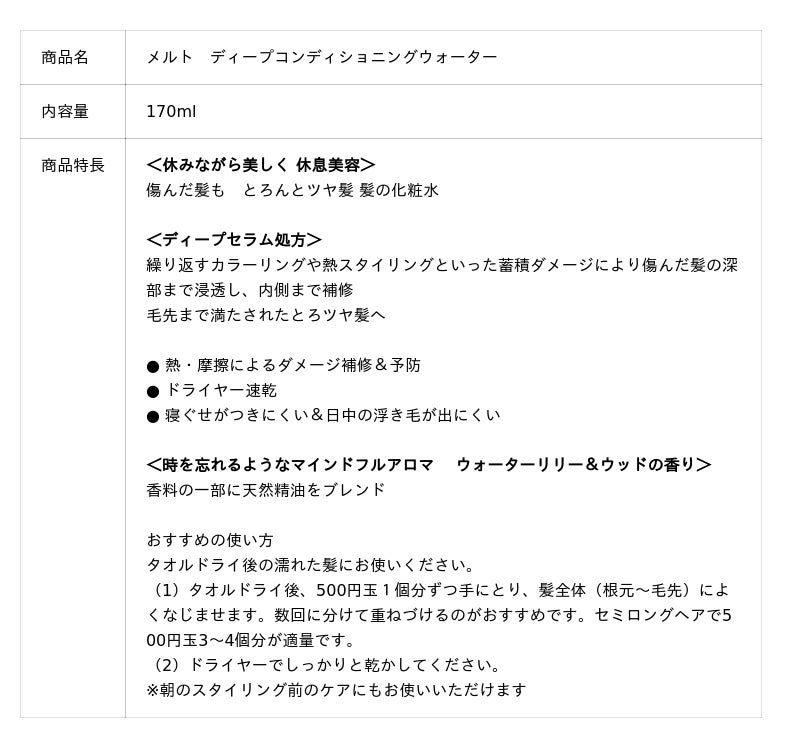 『メルト ディープコンディショニングウォーター』は、ディープセラム処方を採用。とろけるような感触で、髪1本1本を包み込むとともに、蓄積ダメージ*1により傷んだ髪の深部まで浸透し、内側まで補修します。また、メルトコンディショニングウォーター内で初めて、毛髪内部補修技術も採用。ダメージによって硬くなった毛髪を補修し、やわらかい手触りの扱いやすい髪へ。毛先まで満たされたとろツヤ髪に仕上がります。
