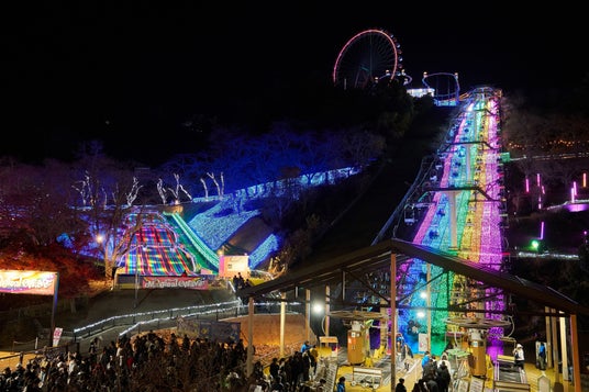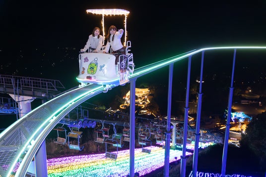 2025年夏にオープンした全長100mのスライダー「マジカルウェーブ」と、標高370mの空中を自転車で漕ぎ出す「青空ペダル」が、夜限定の特別演出として楽しめます。マジカルウェーブでは、鮮やかに光る100mのコースを一気に滑り降りるスリルと爽快感を、青空ペダルは、「さがみ湖で発見!たまごっちのキラキラいるみね~しょん!」エリア登場にあわせて、「たまごっち」仕様の「たまごっちのほしぞらぺだる」として、眼下に広がるイルミネーションを見下ろしながら天空サイクリングを満喫できます。さらに毎年人気の、虹色の光に包まれながら空中散歩を楽しめる「虹のリフト」とあわせて、「三大体験型イルミネーション」として楽しむことができます。そのほか、「たまごっちのキラキラかんらんしゃ」や、カラフルにライトアップする「光の空中アスレチック」など、起伏に富んだアウトドアリゾートならではの、全11種のナイトアトラクションが楽しめます。