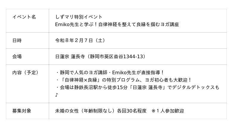 県と市町が運営する公的な結婚支援拠点「しずおかマリッジ」では、非会員の未婚女性を対象とした特別ヨガイベントを開催します。