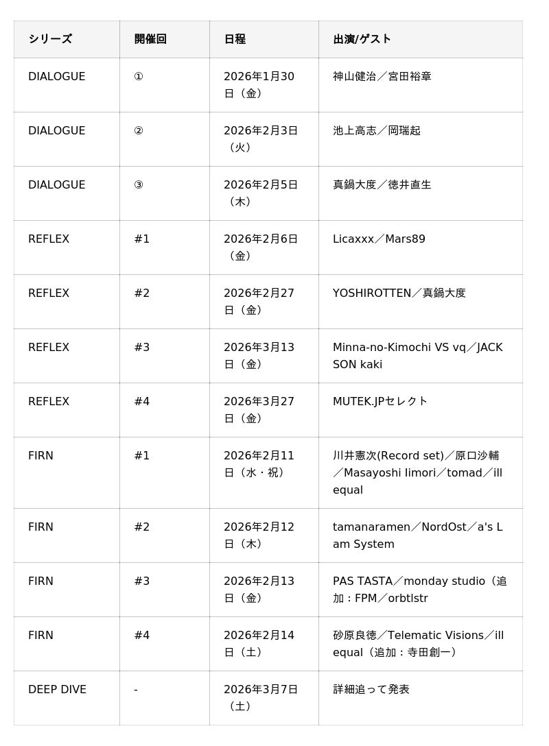 - 週末ナイトミュージアム「REFLEX of Ghost and the Shell」:全4回(2/6、2/27、3/13、3/27)公開。#2に30周年ロゴを担当したYOSHIROTTENと真鍋大度の共演決定。#3はみんなのきもちによるスペシャルライブセット、#4はMUTEK.JPとのコラボ回決定!※出演者詳細は追って発表