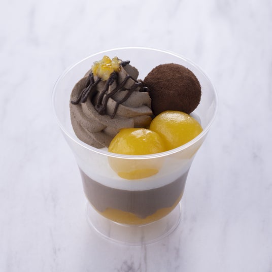 ぷるもち食感のオレンジ葛ゼリー、チョコムース、ミルクムースの上に、濃厚なチョコもち、チョコクリーム、チョコソース、オレンジピール、爽やかな酸味の効いたオレンジわらび餅を盛り付けたパフェです。