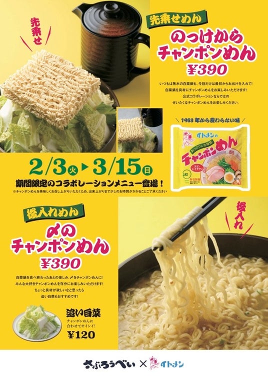石川県のソウルフード「さぶろうべいのとり白菜鍋」と、「イトメンのチャンポンめん」、外食と家庭食の“いつもの味”がコラボレーション!