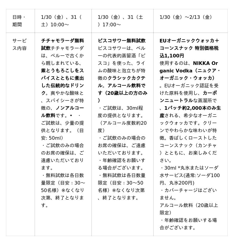 期間中、新商品として導入するペルーの紫トウモロコシを果物やスパイスで煮出したソフトドリンク「チチャ・モラーダ」や、同じくペルーを代表するカクテル「ピスコサワー」の無料試飲を行うほか、EUオーガニック認証を受けた北欧のウォッカとコーンスナックのセットをスペシャル価格(税込1.100円)にて提供いたします。また、SNSフォロワー限定特典として、飲み物を注文した方にアニバーサリークッキーの提供なども予定しています。