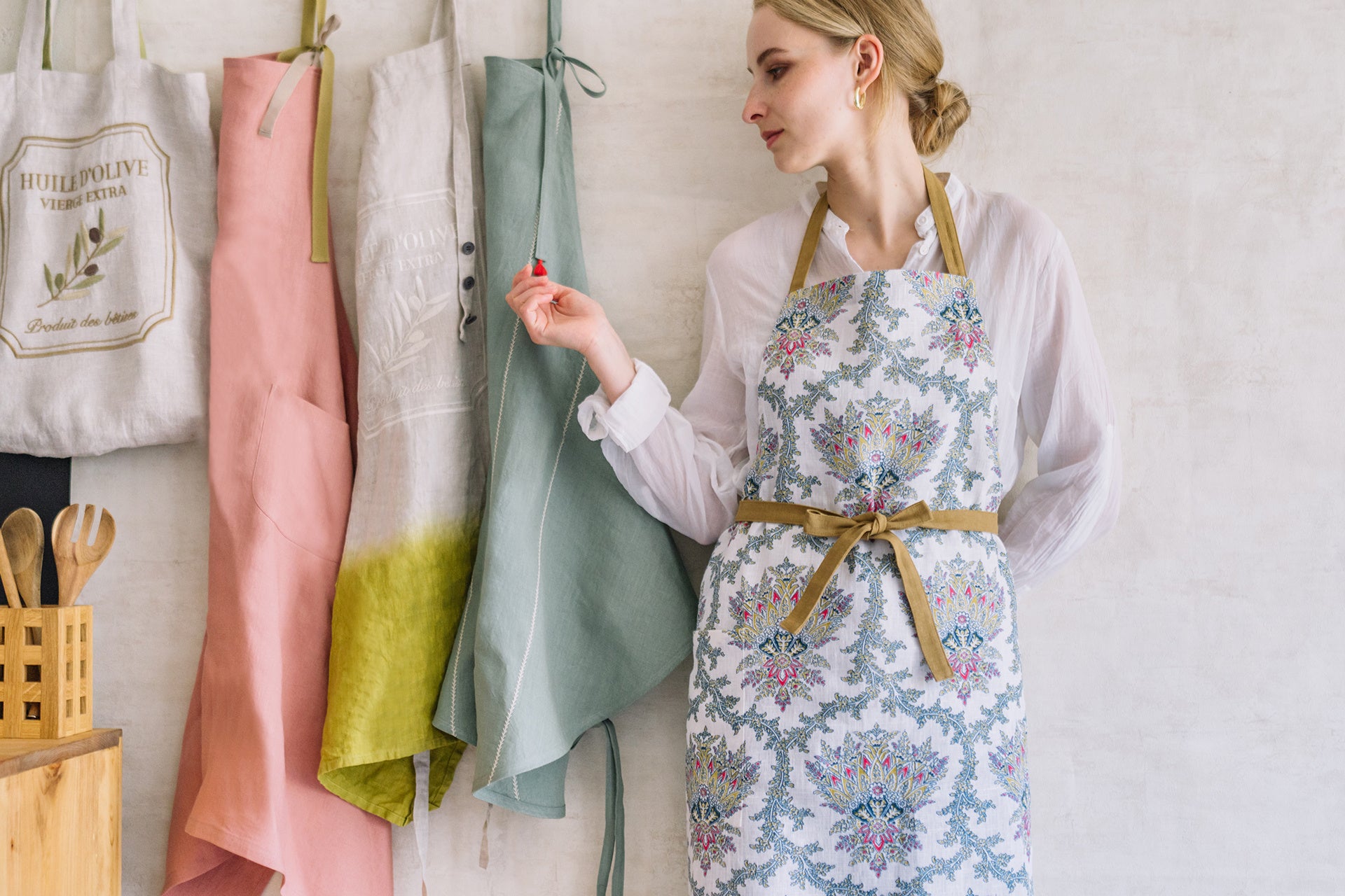 一番人気は自社オリジナルのリネンエプロン