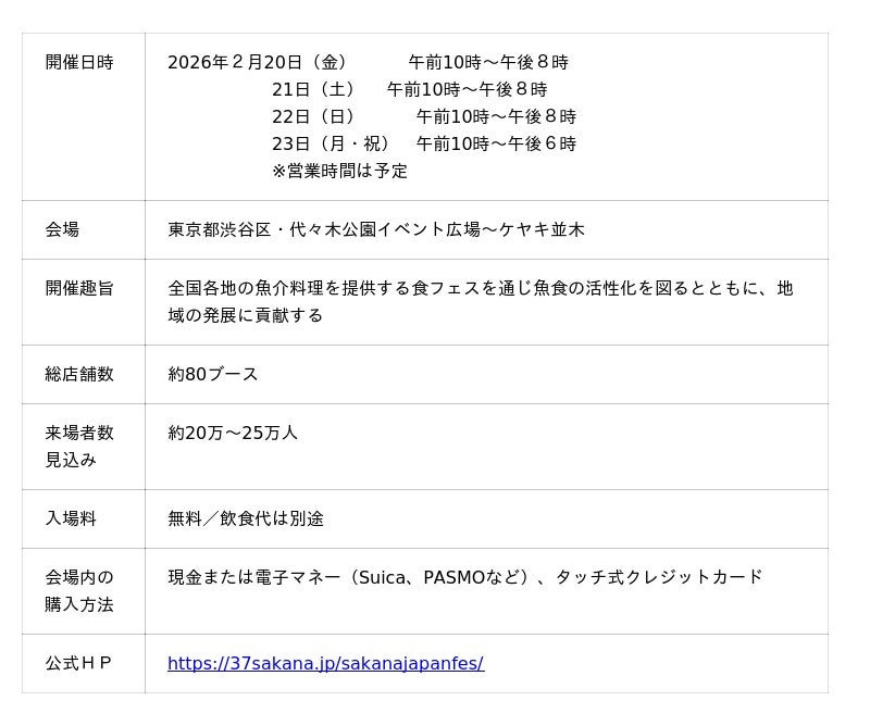 全国各地の魚介グルメが堪能できる「SAKANA&JAPAN FESTIVAL(魚ジャパンフェス)2026 in 代々木公園」(主催・SAKANA&JAPAN FESTIVAL実行委員会)が2026年2月20日(金)~23日(月・祝)の4日間、東京都渋谷区の代々木公園イベント広場~ケヤキ並木で開催されます。四方を海に囲まれた日本の大切な食文化で、栄養豊富な「魚食」の活性化を目的に開催。姉妹イベントを合わせた累計来場者数が約270万人に上る日本最大級の魚介グルメフェスティバルです。