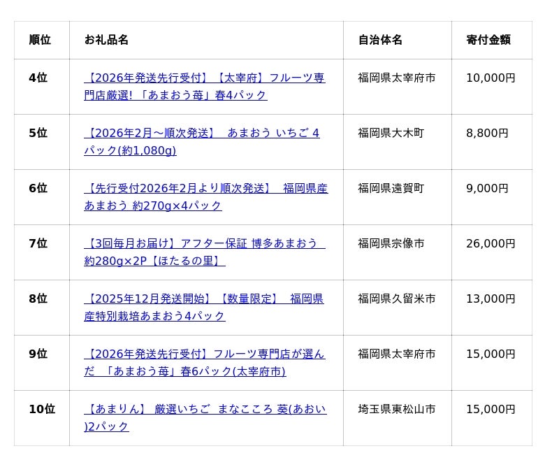 【ふるさと納税お礼品トレンド】福岡県産「あまおう」が人気の「いちご」として不動の1位
