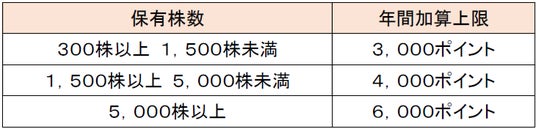 - 300株以上保有の株主さまを対象に、保有株数に応じて年間2,000~24,000ポイントの株主優待ポイントを付与します。- 3年以上継続して保有している株主さまへは、さらに株主優待ポイントを年間1,000~4,000ポイント加算します。