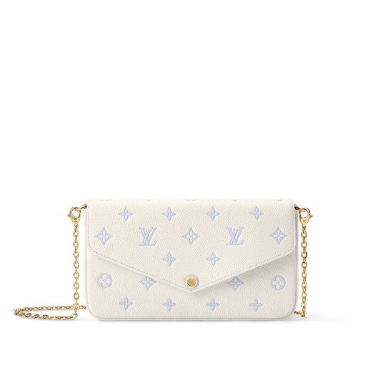 「スウィート・エスケープ」コレクションから登場し、ミルキーホワイトとブルーのバイカラーの色合いで再解釈された「ポシェット・フェリシー」。メゾンを象徴するモノグラム・アンプラント レザーで仕上げ、2つの取外し可能なポケットを備えています。1つはファスナー付き、もう1つには8つのカードスロットが付いています。エレガントなゴールドカラーのチェーンにより、多彩な持ち方を楽しめる一品。
