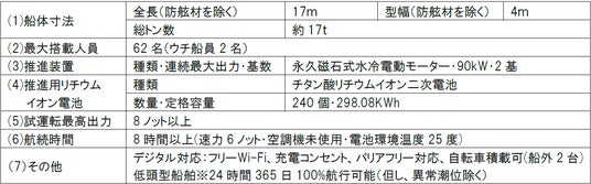 総トン数20トン未満の日本小型船舶検査機構管轄の船では、国内最大級の約300kWhのリチウムイオン電池を搭載し、定期航路を航行する本船に必要な電力をまかないます。主機関や発電機などの内燃機関を船から全廃したことにより、航行中はCO2の排出がありません。