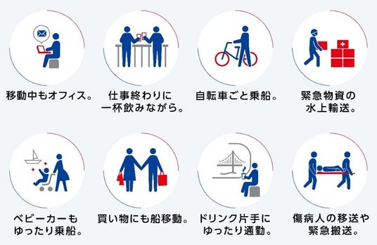 買い物や通勤などの日常使いをはじめ、ウォーターフロント周辺観光スポットへの国内外旅行者の移動手段として、空・水・風を感じるWell-beingな移動体験を提供します。また、有事の際には、海上アクセスルート確保により、人・物資の輸送に充てることや、本船からのスマートフォン等への逆給電も想定しています。