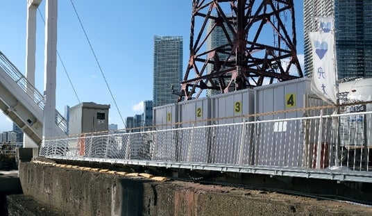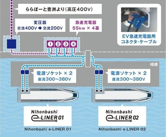 本船への電力(再生エネルギー)は、ららぽーと豊洲内にある高圧受電設備から送電・再変圧し、4基の急速充電器に供給しています。
