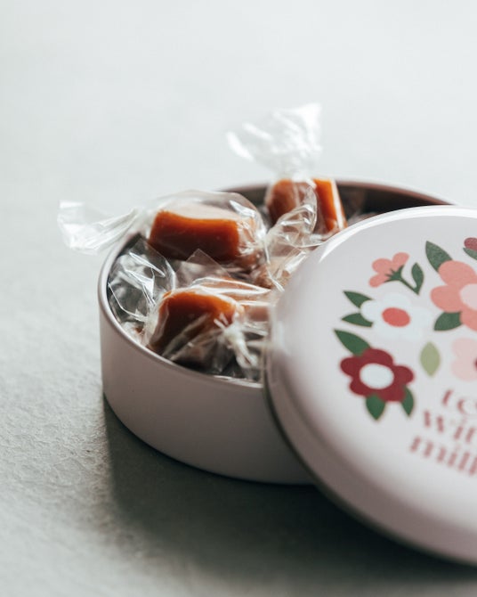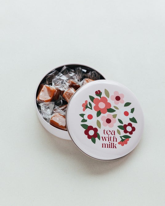 やわらかなピンク色の缶の中には、キャンディ状に包んだミルクティーキャラメルが15粒。