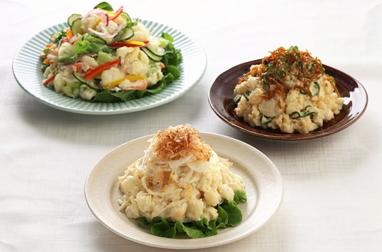 左上から半時計周りに1.彩り野菜の北海道産さやかポテトサラダ→2.だしの旨味香る和風オニスラ(R)ポテトサラダ→3.里芋の和風ポテトサラダ