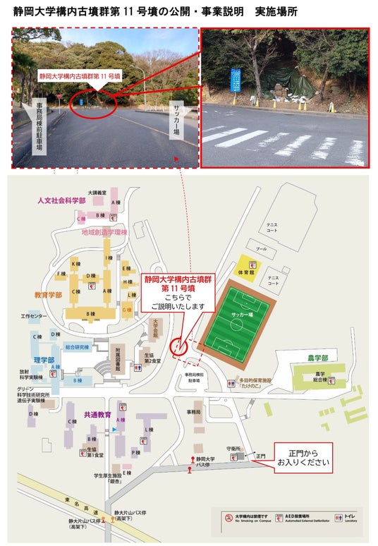 静岡大学キャンパスミュージアムと人文社会科学部考古学研究室では、今年度計画「博物館DXによるキャンパスミュージアム(大学丸ごと博物館構想)の再構築」の一環として、大学構内に存在する静岡大学構内古墳群第11号墳の再発掘調査を実施しました。同古墳は7世紀頃の横穴式石室を埋葬施設とする古墳ですが、1996年のキャンパスミュージアムの立ち上げ当初、「大学丸ごと博物館構想」の資料の一つとして、当時の人文学部考古学研究室が発掘し、公開を計画していたものです。当時、公開のための整備はかなわず、現地に埋め戻して保存してありましたが、現在可能になった3Dなどのデジタル技術を用いた記録を作成し公開する目的で、再発掘調査を行い、現在石室を露出させているものです。2月5日から公開し、2月19日にはドローン撮影や3DスキャンなどのDXワークショップを実施する予定です。