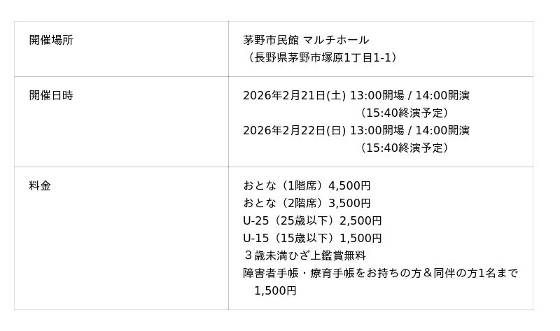 2026年2月21日(土) ・22(日)にムーンナイトサーカス2026 ちの公演(主催:文化庁・医療法人社団オレンジ)、3月21日(土) はた公演(主催:一般財団法人松本市芸術文化振興財団)を開催