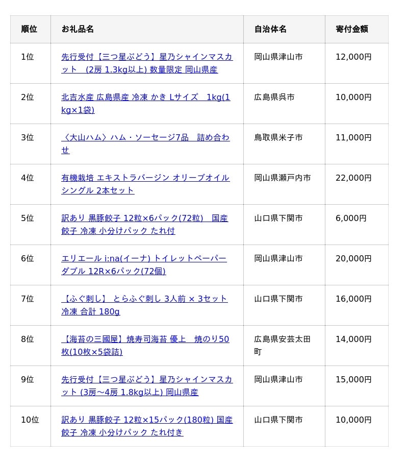 <中国地方版>2025年ふるさと納税人気お礼品ランキング(確定)詳細は以下よりご確認ください。