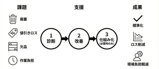 食品ロス削減を「コスト削減」だけで終わらせず、「欠品の減少による売上機会の回復」まで含めて、粗利の安定化・改善を支援します。