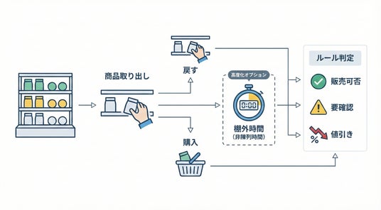 当社は、商品が棚から取り出され、棚に戻るまでの「棚外時間(非陳列時間)」を算出し(推定を含む)、その結果を販売可否や割引等の処理へ反映する技術に関する特許(特許第6345366号)を保有しています。食品提供現場のロスや粗利毀損は、単に「売れ残り」だけでなく、