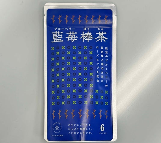 ブルーベリーの名産地、能登町のブルーベリーを剪定した際の枝を活用できないかと開発された新しいお茶。棒茶の香ばしさとハーブティーの酸味を楽しめる上、ブルーベリーの枝と葉には抗酸化物質がたっぷり。
