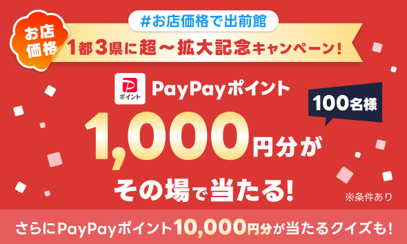 本エリア拡大を記念し、XにてPayPayポイントが当たる「#お店価格で出前館 1都3県に超~拡大記念インスタントウィンキャンペーン!」を実施いたします。