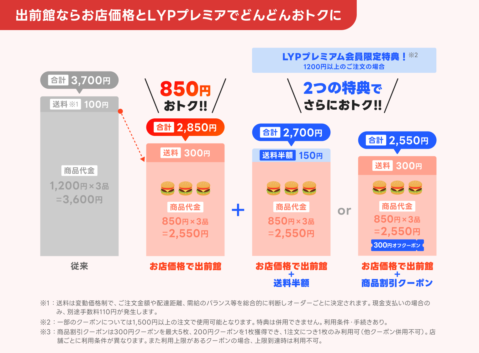 LYPプレミアムは、LINE、ヤフー、PayPayがもっと楽しく便利になる特典を月額508円(税込)から利用できる月額制サービスです。本特典にて「お店価格で出前館」に参加する人気のブランドで使える1.商品割引クーポンと、期間中いつでも何度でも使える2.送料半額クーポンをご用意しており、より便利でおトクにご利用いただけます。(諸条件がございますので、詳細ページを確認ください。)