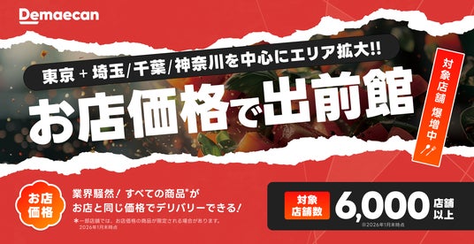 株式会社出前館は、運営するデリバリーサービス「出前館」において、お店と同じ商品価格でデリバリーできる「お店価格で出前館」を、2026年2月1日(日)より1都3県(東京、埼玉、千葉、神奈川)を中心に対象エリア拡大します。これにより「お店価格で出前館」の対象店舗は全国で6,000店舗以上となります。