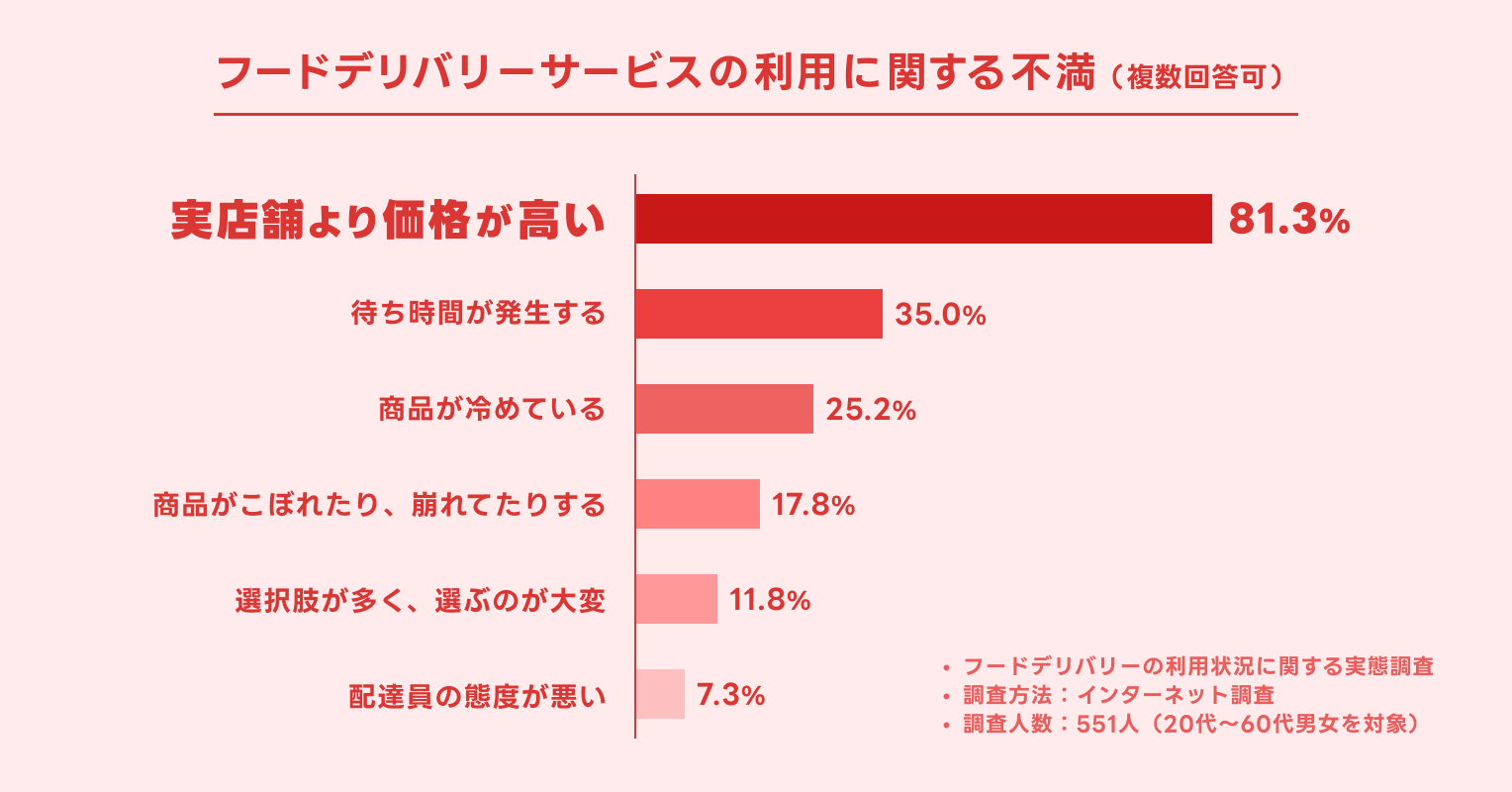 インターネット調査「フードデリバリーの利用状況に関する実態調査」(実施:合同会社YUM JAM、2025年4月、n=551)によると、「フードデリバリーサービスの利用に関して不満はありますか?(複数回答可)」の質問に対して、最も多かった回答が「実店舗よりも価格が高い」(81.3%)という結果となっています。