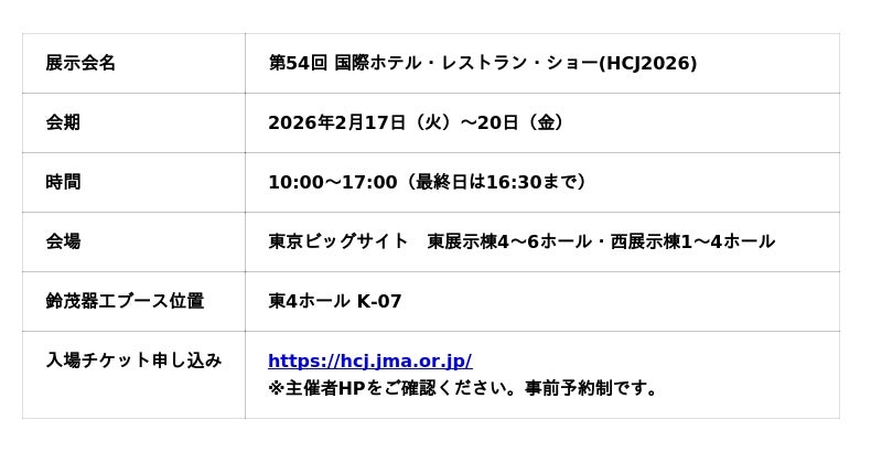 鈴茂器工株式会社(本社:東京都中野区、代表取締役社長:谷口徹)は、2026年2月17日(火)から20日(金)に東京ビッグサイトで開催される第54回 国際ホテル・レストラン・ショー(以下 HCJ2026)に出展いたします。鈴茂器工ブースは【東4ホール K-07】です。
