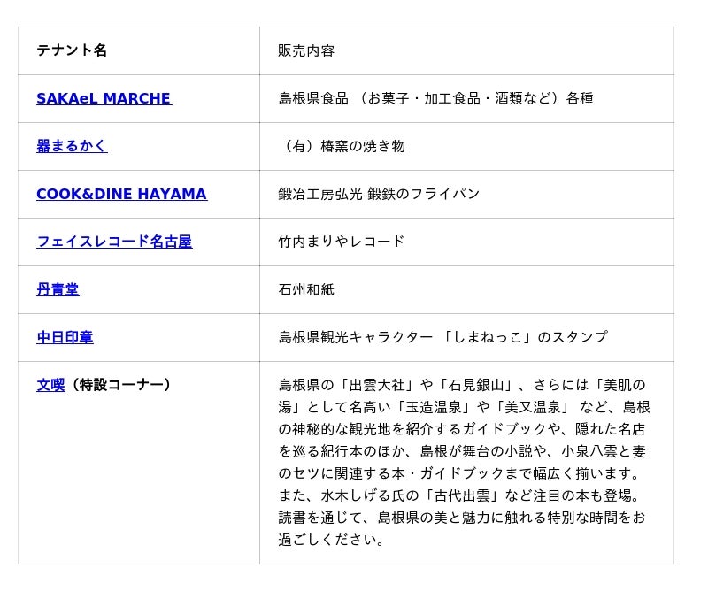 「ご縁と美肌の国」で名高い島根県の「食」や「文化」、「歴史」、「観光名所」など、様々な魅力を楽しめる催しを展開いたします。島根県は現在、明治時代の島根県松江市を舞台にした朝のドラマでも盛り上がりを見せ、注目されている県でも あります。様々なテナントが入る中日ビルの特性を生かし、飲食テナントでは「宍道湖しじみ」や「しまね和牛」を使用した期間限定メニューを提供し、物販テナントでは島根県の工芸品の販売、お菓子や練り物など食品の販売、島根出身アーティストのレコードの販売、オフィスやホテルとのタイアップイベントも行います。 また、体験型イベントとして、島根県の観光キャラクター「しまねっこ」との交流や和菓子文化が根付く京都、金沢と並ぶ「日本三大菓子処」のひとつ、松江の和菓子作り、しじみのみそ玉作りなども開催いたします。期間中、島根県なごや情報センターでも関連イベントを実施いたします。見て、触れて、味わって、島根県の奥深い魅力を余すと ころなくお楽しみください。