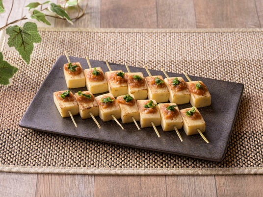 (右)焼き色のついた豆腐に、ほんのり甘く深みのある福島県産の味噌を絡めた、"やさしい甘味の味噌田楽"【郡山限定】