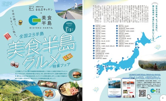 区、代表取締役 社長執行役員:盛崎宏行)は、直営飲食店舗『editor’s fav るるぶキッチン』(以下『るるぶキッチン』)において、2026年2月3日(火)から、全国23半島のブランド化推進のため同半島の特産品を使用した「全国23半島 美食半島グルメ」特集フェアを開催します。