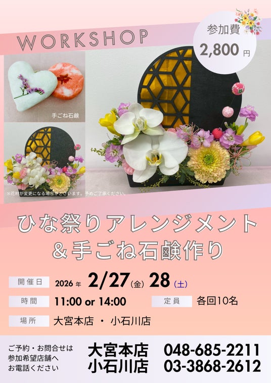 有限会社黒臼洋蘭園(本社:埼玉県さいたま市)が運営する胡蝶蘭専門店「らんや」は、2026年2月27日(金)・28日(土)の2日間、「らんや大宮本店」および「らんや小石川店」にて、ワークショップ「ひな祭りアレンジメント&手ごね石鹸作り」のイベント(https://kotyou.net/2026/01/15/6327/ )を開催いたします。本ワークショップは、ひな祭りをテーマにした季節感あふれるフラワーアレンジメント制作と、香りや色を楽しめる手ごね石鹸作りを同時に体験できる内容です。お子さまから大人の方まで、ものづくりの楽しさを感じていただける春の特別企画となっております。