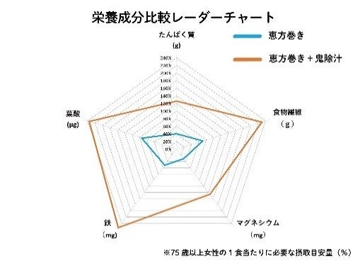 節分に恵方巻だけを食べると栄養が偏りがちですが、豚汁に蒸し大豆を加えた『鬼除け汁(節分汁)』をプラスすれば、大豆を簡単に食べられるだけでなく、根菜の食物繊維や豚肉、大豆のたんぱく質等で、献立として栄養バランスを整えることができます。咀嚼が難しいご高齢の方は、蒸し大豆を入れて10分ほど煮込んでいただくとさらにやわらかくなり、食べやすくなります。(データ 栄養成分:日本食品標準成分表(八訂)、1食あたりに必要な摂取目標量:厚生労働省 日本人の食事摂取基準(2025年版))