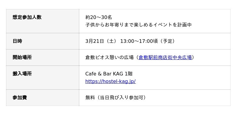 今回の倉敷での実施においても、当日の反響が大きければ、将来的には形を変えながら、不定期でも第二回、三回と継続していくプロジェクトへと繋げていければと考えています。