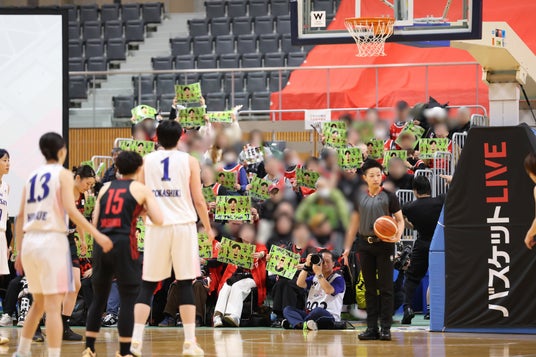 またゴール下付近で観戦される皆さまには、マッチョになった大神雄子ヘッドコーチのイラストが描かれたボードを手に応援いただき、試合を一層盛り上げました。