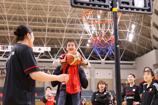 メインコートでおこなわれた対決では、参加者はフリースローラインから、ハンディキャップとして選手はスリーポイントラインから1投ずつ投げ、先に決めたほうが勝利というサドンデス方式で実施。白熱した展開に会場からは大きな歓声が上がりました。