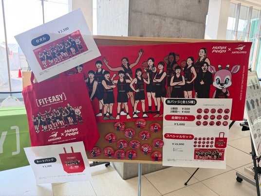 会場では当社の特設ブースを設け、アンテロープスの選手全員が集合したイラストがあしらわれたトートバッグやタオル、各選手などの缶バッジの3種類(オリジナルコラボグッズ)を販売しました。