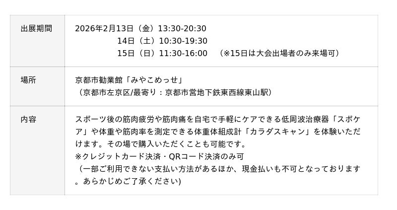 2026年2月13、14日に京都市勧業館「みやこめっせ」で開催される「おこしやす広場」、ならびに大会当日に同会場で大会参加者向けに開かれる「おつかれさま広場」にリカバリーブースを出展します。