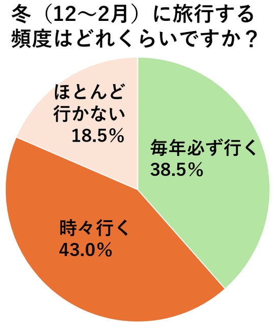 寒さも厳しく、出かけるのが億劫になりがちな冬ですが、まずはそんな冬に旅行をする頻度について伺いました。毎年冬に必ず旅行するという人は38.5%。時々行く、という人は43.0%で、旅好きな読者のうち81.5%の人が冬の旅を楽しんでいることがうかがえました。(n=724)